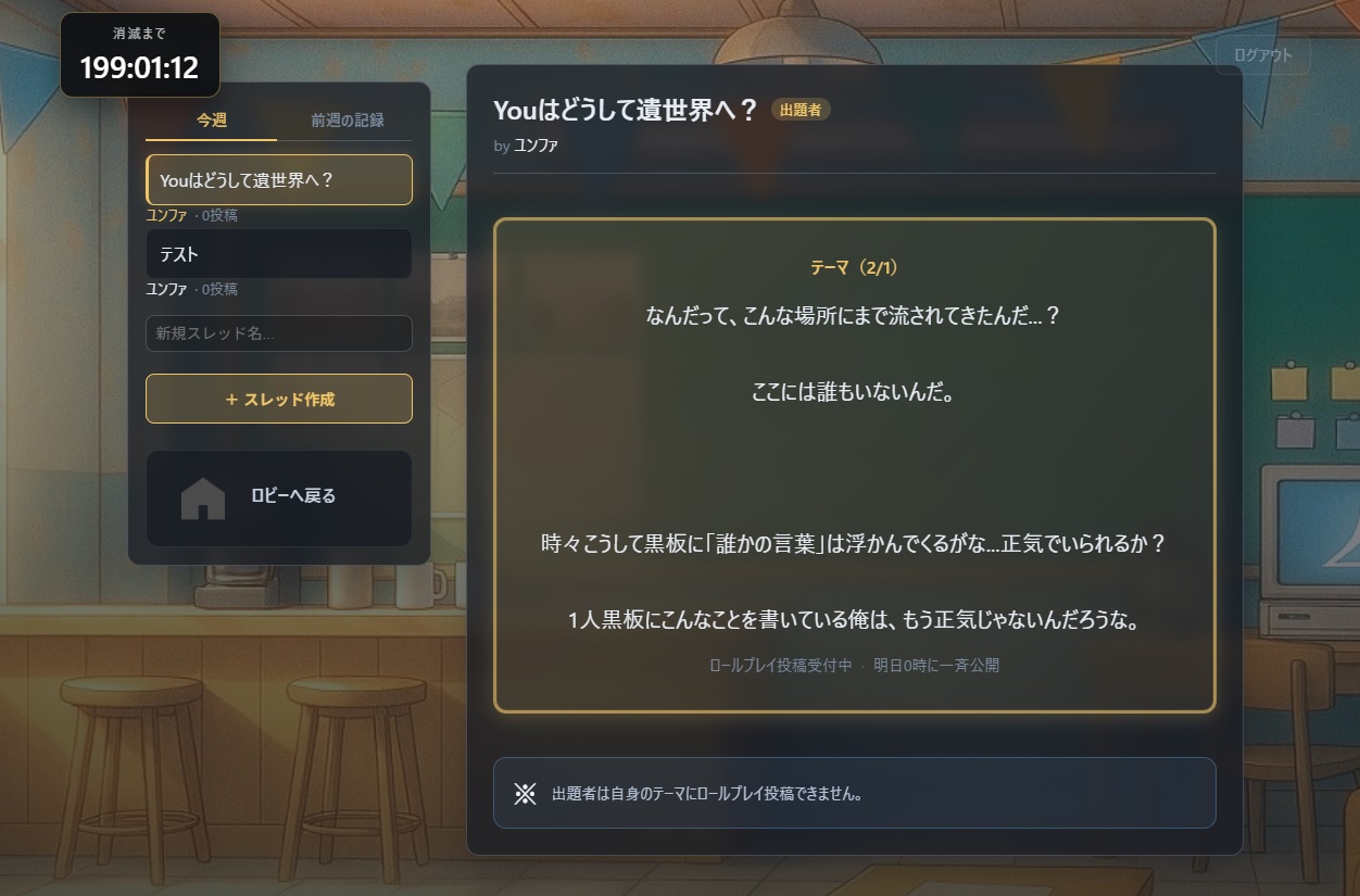 - テーマ:出題者が投稿するお題です。このお題に対してロールプレイで回答します。