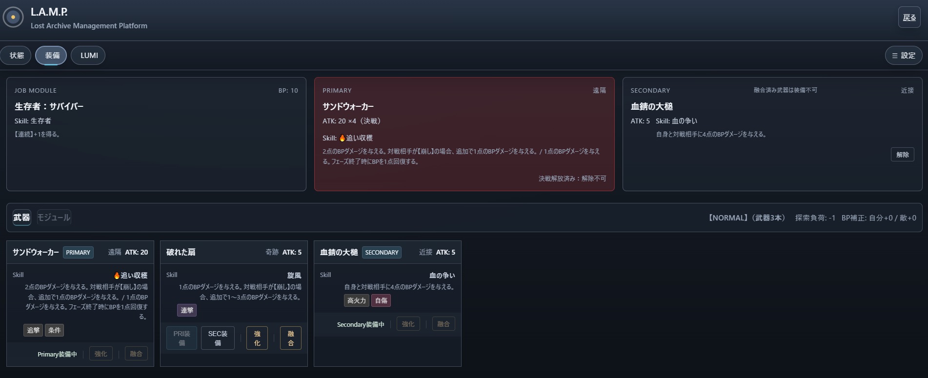 - ※武器は2~3つ程度に整理すると安定します。余剰武器は融合や強化、LUMIを活用して消費してください。